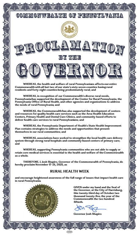 To draw attention to the wide range of issues that impact rural health, Pennsylvania Gov. Josh Shapiro has declared November 17-21, 2025, as Rural Health Week in Pennsylvania at the request of the Pennsylvania Rural Health Association (PRHA) and the Pennsylvania Office of Rural Health (PORH).
